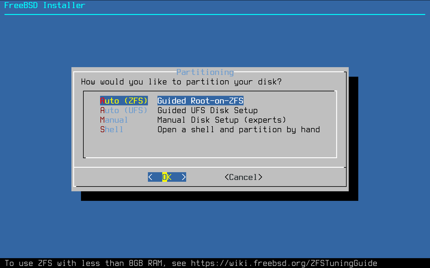 Установка операционной системы FreeBSD не вызывает никаких сложностей после пары попыток проделать его самостоятельно. Всё сводится к последовательному ответу на вопросы инсталлятора bsdinstall.